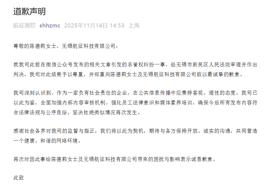 近日,上海航征测控系统有限公司就此前名誉权纠纷事宜,已在其官方渠道发布道歉声明,承认发布不实信息并致歉。借此机会,我们向广大客户朋友作以下重要说明:
