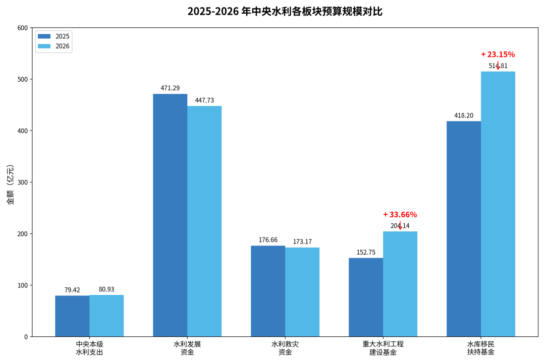 同时配套水利救灾防灾资金:2025 年 176.66 亿元、2026 年 173.17 亿元,规模基本持平,持续筑牢防汛抗旱应急资金底线。